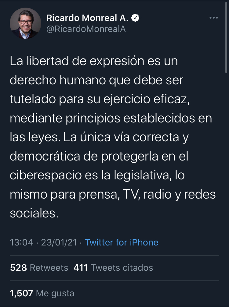 El 23 de enero del 2021 el diario El Universal publicó una nota informativa basada en una publicación hecha en la red social Twitter en la que el líder de la bancada de Morena en el Senado de la República, Ricardo Monreal Ávila, advierte que es necesario proteger la libertad de expresión en las redes sociales.