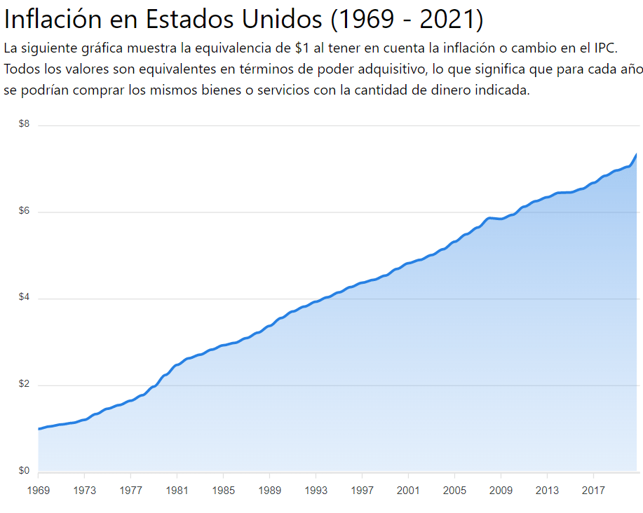 Tus pesos o tus dólares han sufrido el mismo destino. Observa la siguiente gráfica del dólar norteamericano para que descubras como desde 1971, año en que se rompió el acuerdo Breton Woods el valor de la moneda norteamericana ha disminuido, lo que significa que todo aquello que tu podías comprar con 1 USD en 1971, en 2021 necesitabas 6.29 USD y con los índices inflacionarios del 2022, necesitas 7 dólares con 39 centavos.