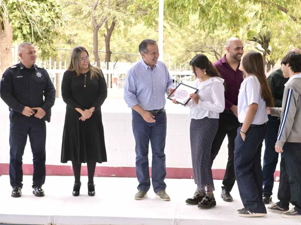 Jorge Luis González Fimbres y Cora Patricia Mora, directores de la secundaria, recibieron a las autoridades y a las regidoras Dulce Robles y Carla Salcido, invitadas especiales a la ceremonia.