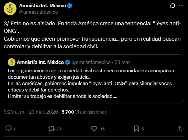 Además, advirtió que este tipo de medidas se repite en América Latina mediante las llamadas “leyes anti-ONG”, diseñadas para debilitar a la sociedad civil.
