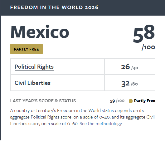 Hoy, en el informe 2026, México alcanza 58 puntos: 26 en derechos políticos y 32 en libertades civiles. La caída es consistente y transversal a distintos gobiernos.