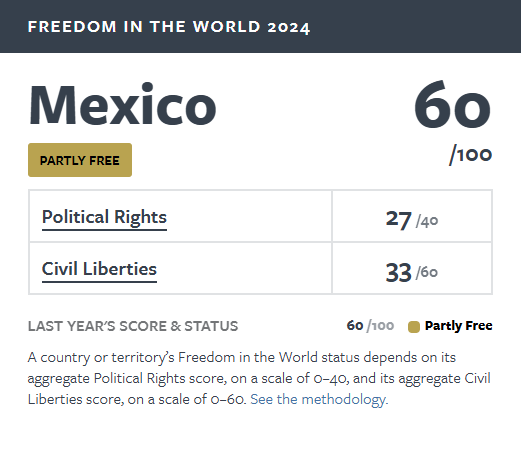 En 2017, con datos de 2016, México era considerado “parcialmente libre” con 65 puntos: 28 en derechos políticos y 37 en libertades civiles.