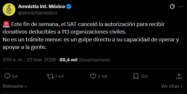 El 22 de marzo, el Servicio de Administración Tributaria eliminó el permiso de donataria autorizada a 53 organizaciones civiles, incluidas aquellas que vigilan indicadores económicos, evalúan políticas públicas o denuncian corrupción.